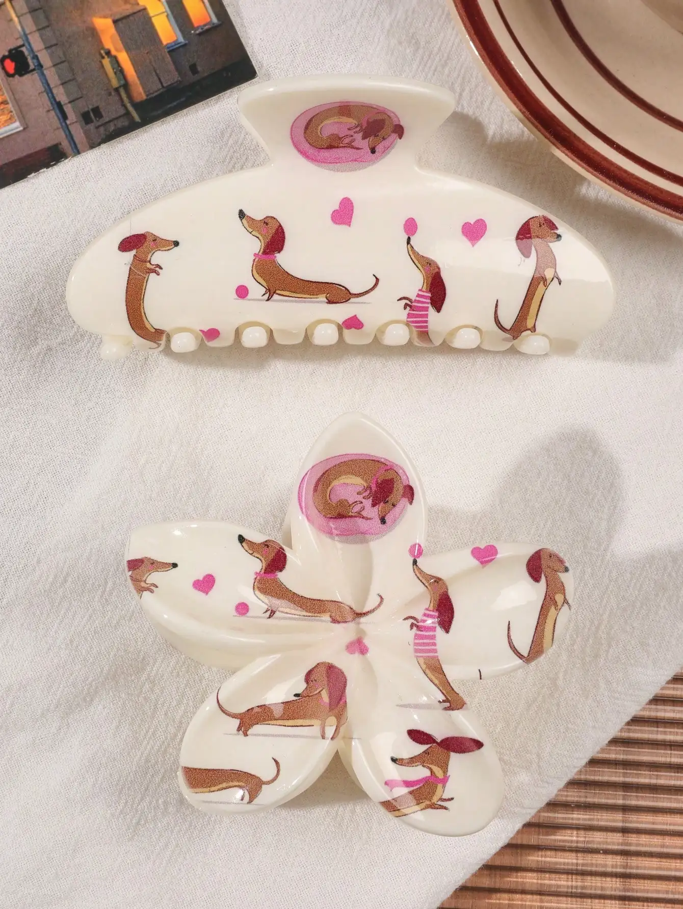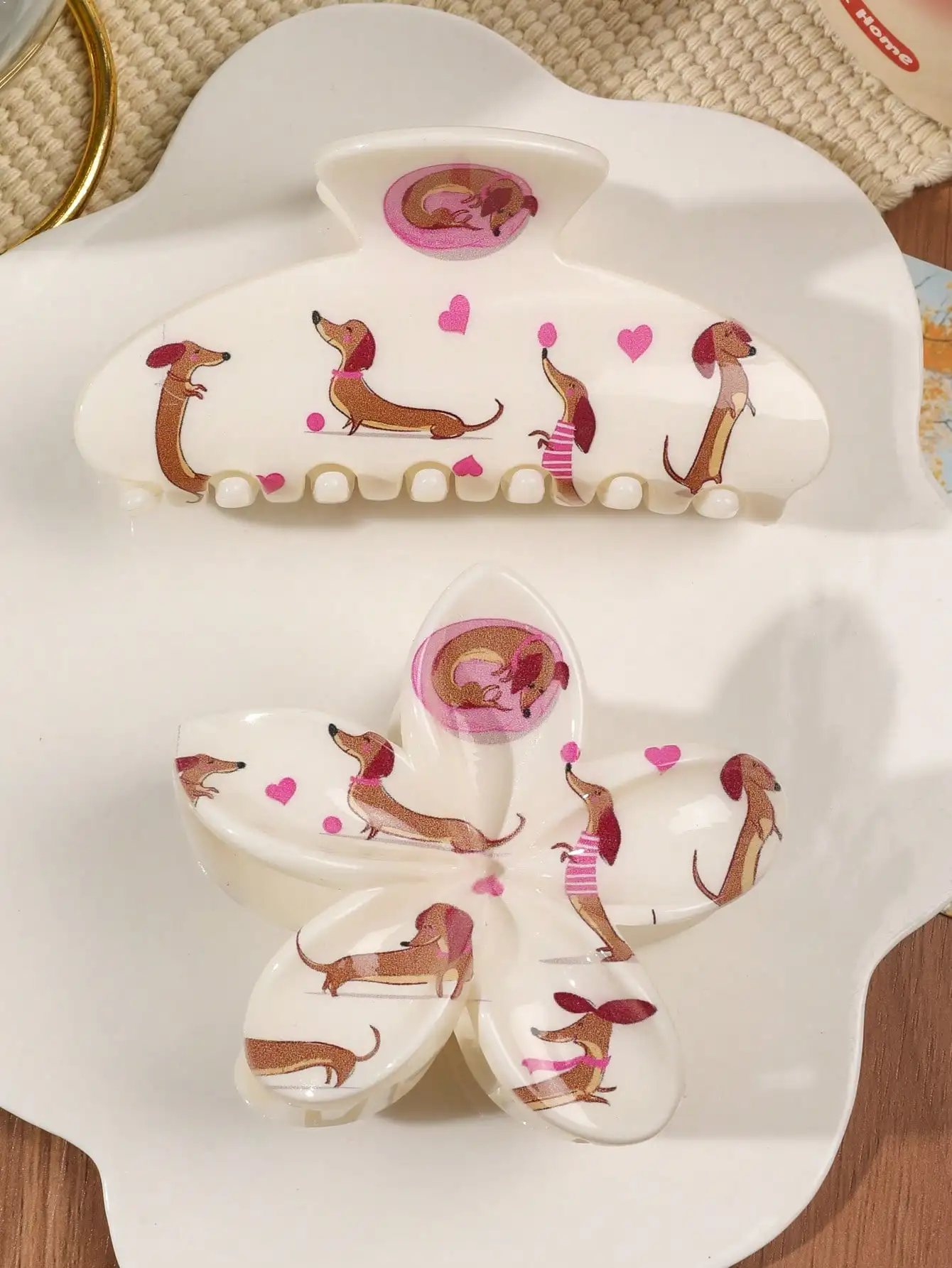 2Pcs Cute Pink Dachshund Heart Print Hair Clips For Women