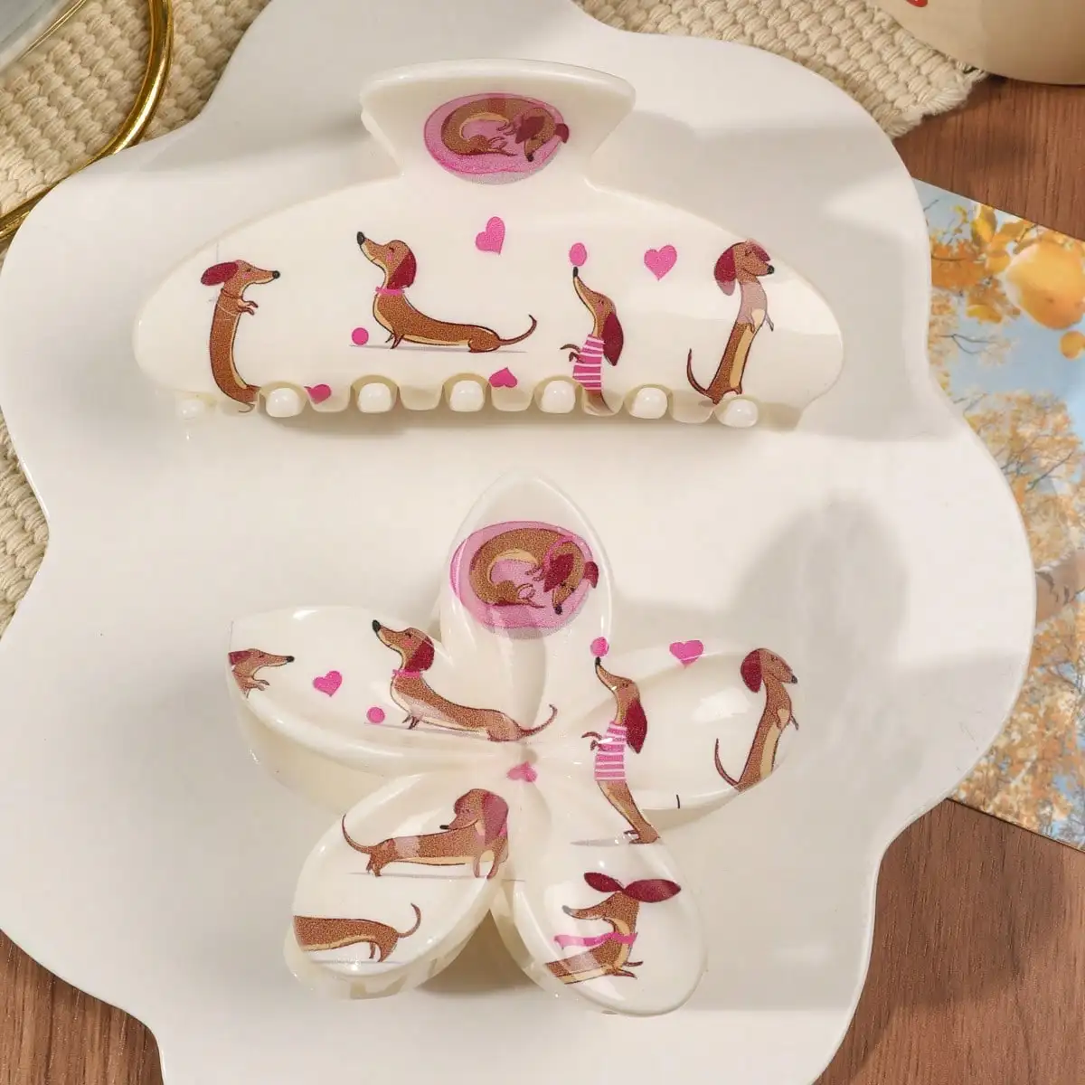 These hair claw clips feature a cute pink dachshund heart print, adding a touch of fashion to any outfit.